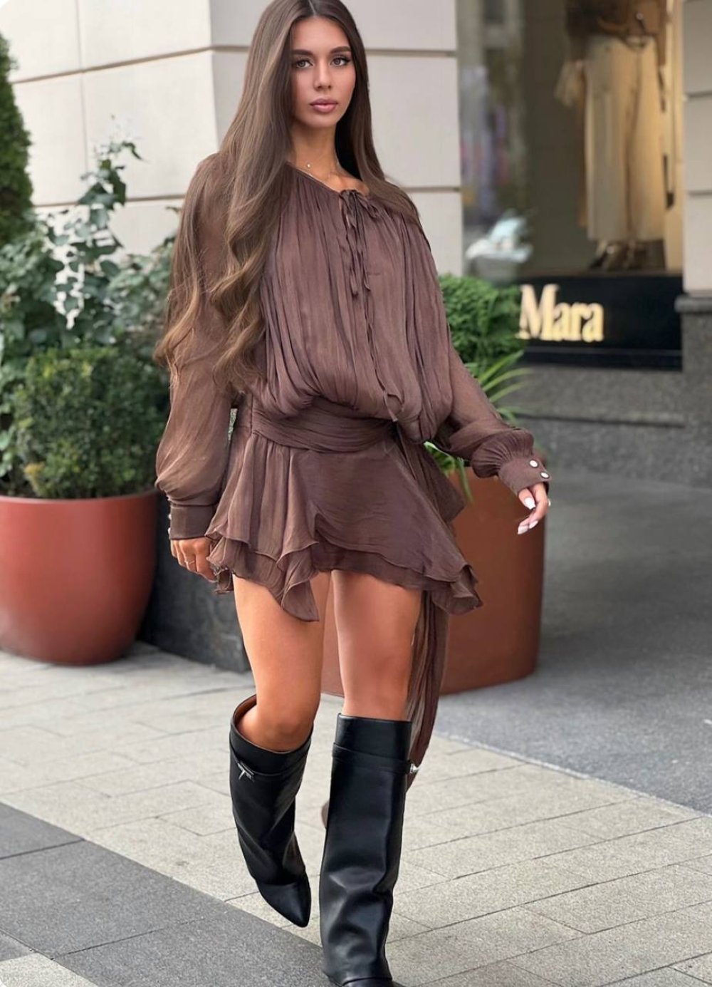 Barcelona Mini Yaka İp Detay Elbise Acı Kahve