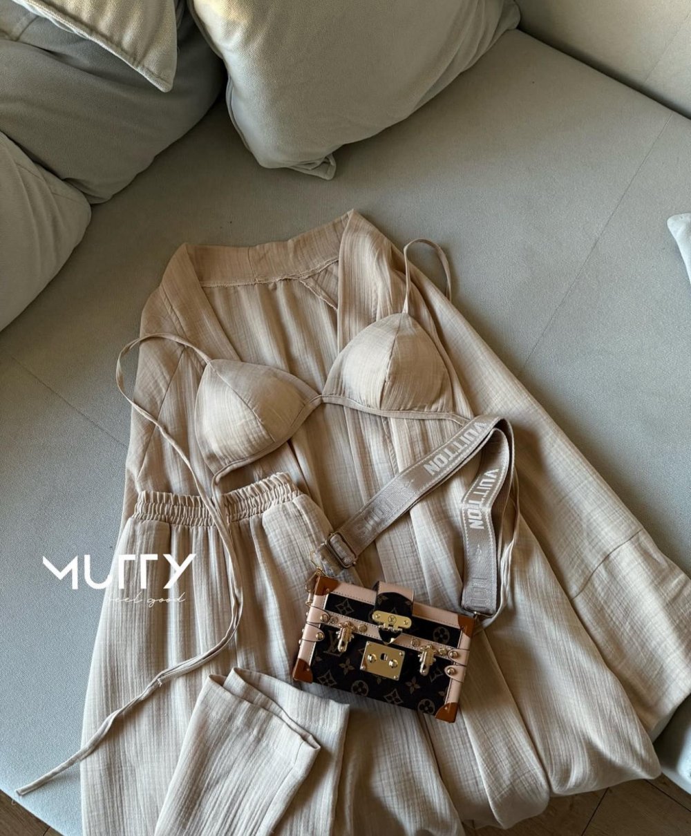 Beijing Maxi Boy Kimono + Pantolon + Pedli Crop 3lü Set (BUGÜNE ÖZEL) Bej