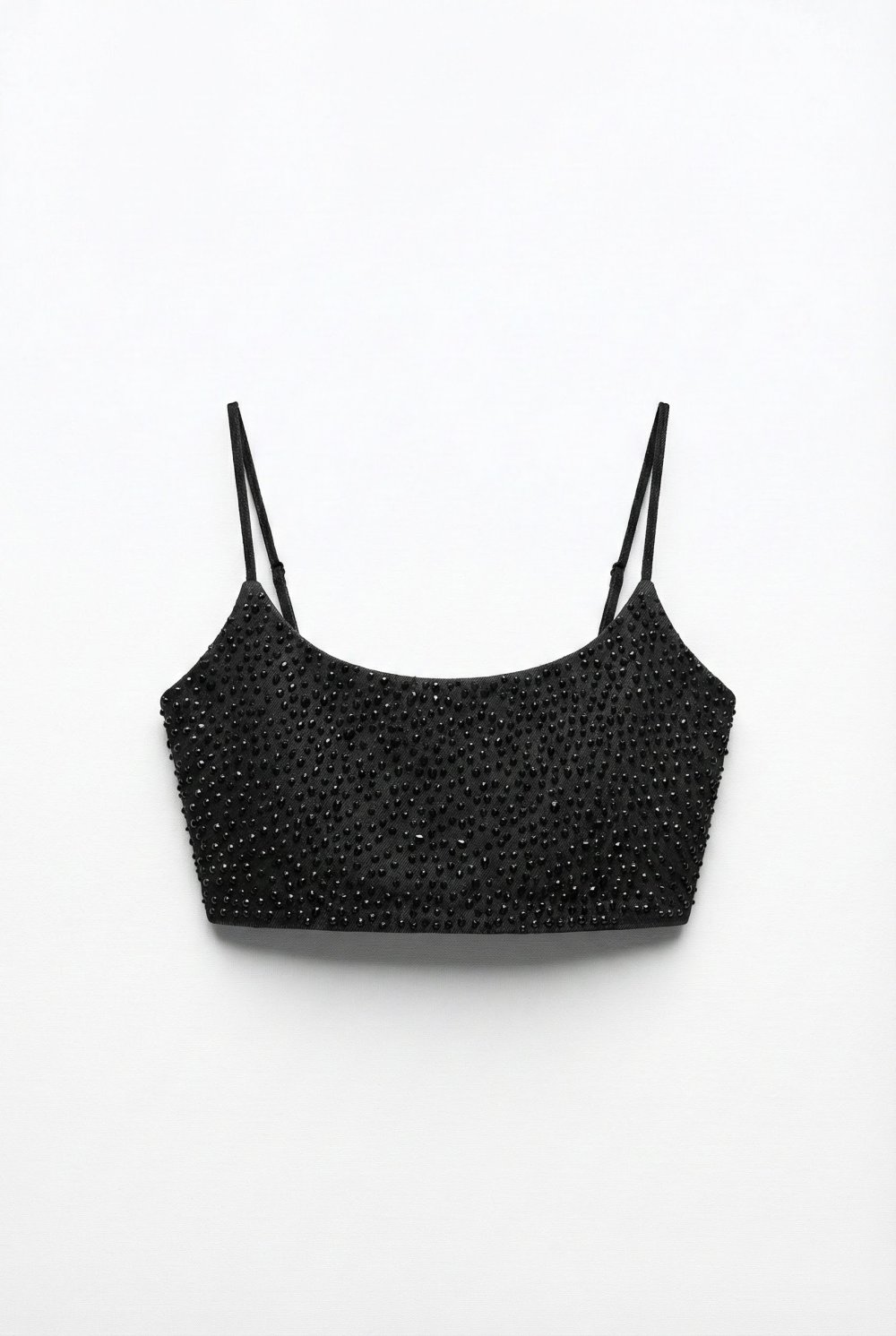 Vücut hatlarını zarifçe vurgulayan kesimi sayesinde bustiyer veya şık bir crop top olarak tercih edilebilir. Siyahın asaletini denim dokusuyla buluşturan bu tasarım, yüksek bel pantolonlar ve eteklerle mükemmel bir uyum yakalar.