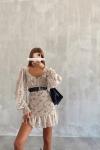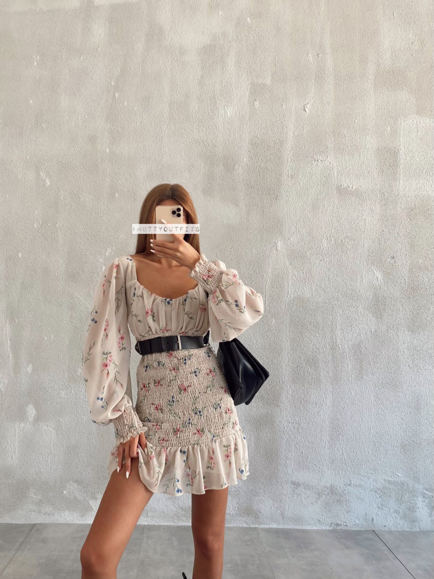 Kesie Çiçekli Astarlı Şifon Elbise Bej