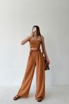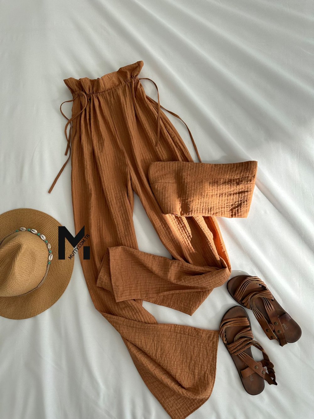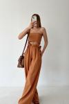 Kety Pantolon+Crop Rahat Kalıp Bohem Takım Kahverengi