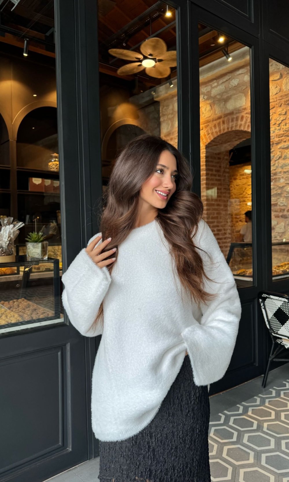 Kira Sıfır Yaka Yumoş Oversize Kazak Beyaz
