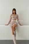 Leylie Şifon Cicekli Crop Bluz Etek Takım Bej