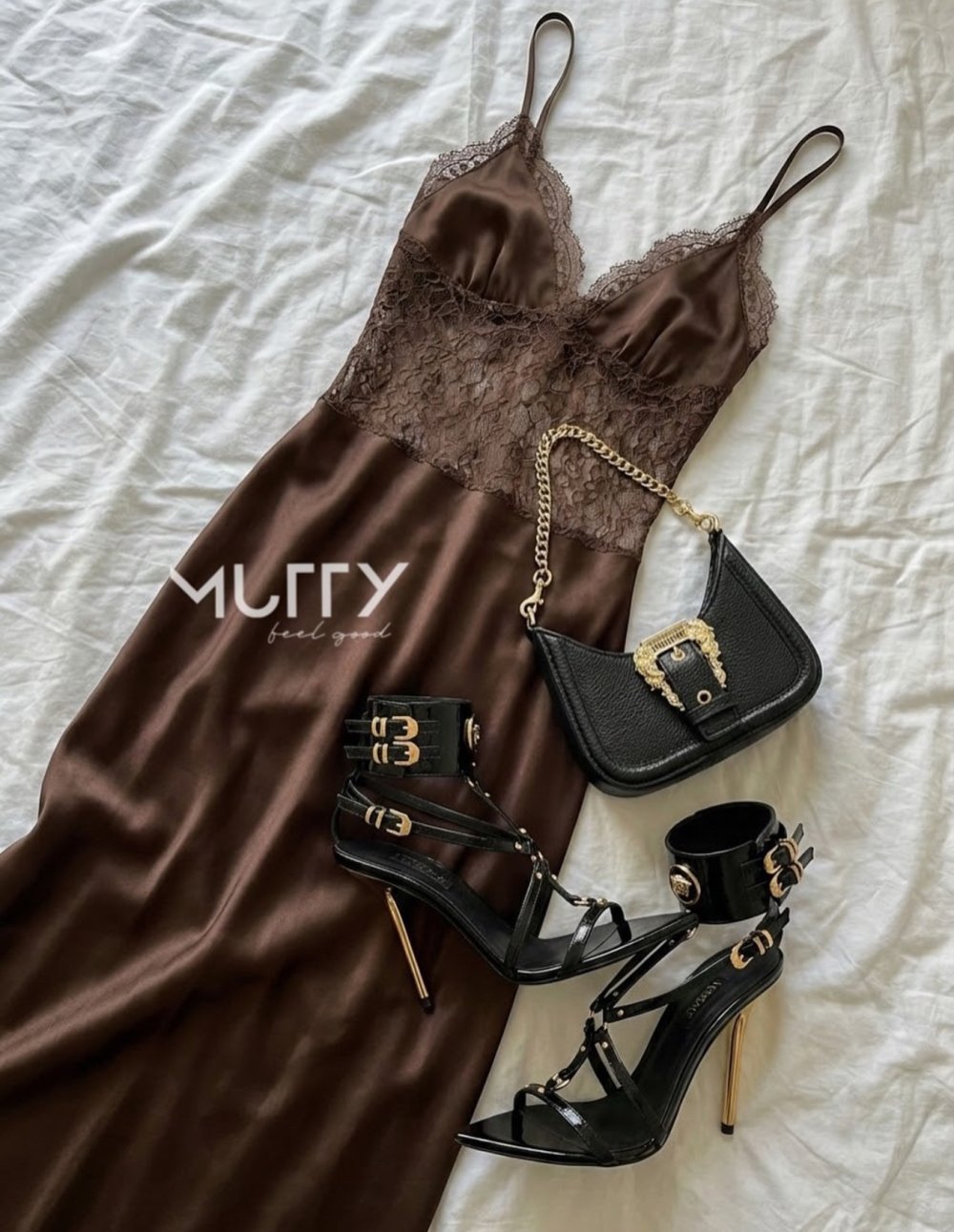 Milwal Dantel Detaylı Saten Elbise Kahverengi