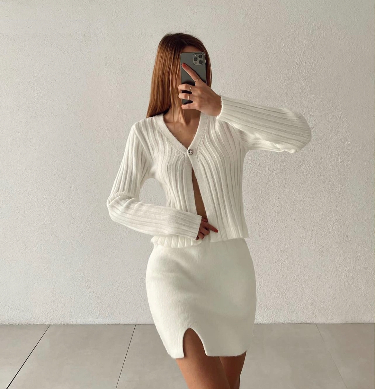 Niola Hırka+Etek İnci Düğmeli Harika Yumoş Takım Beyaz