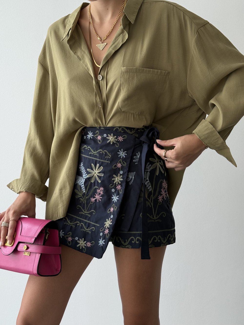 Modern tasarımı ve zarif detaylarıyla öne çıkan Ole Nakışlı Anvelop Premium Şort Etek, gardırobunuza sofistike bir dokunuş katıyor. Lacivert rengin zamansız şıklığını nakış işlemeleriyle buluşturan bu özel parça, hem etek zarafetini hem de şort rahatlığını bir arada sunar.