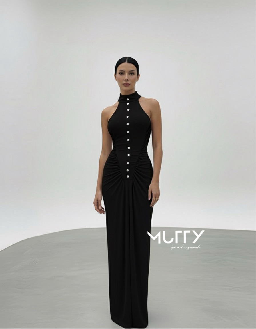 Sonia Dugme Detayli Drapeli Maxi Elbise Siyah