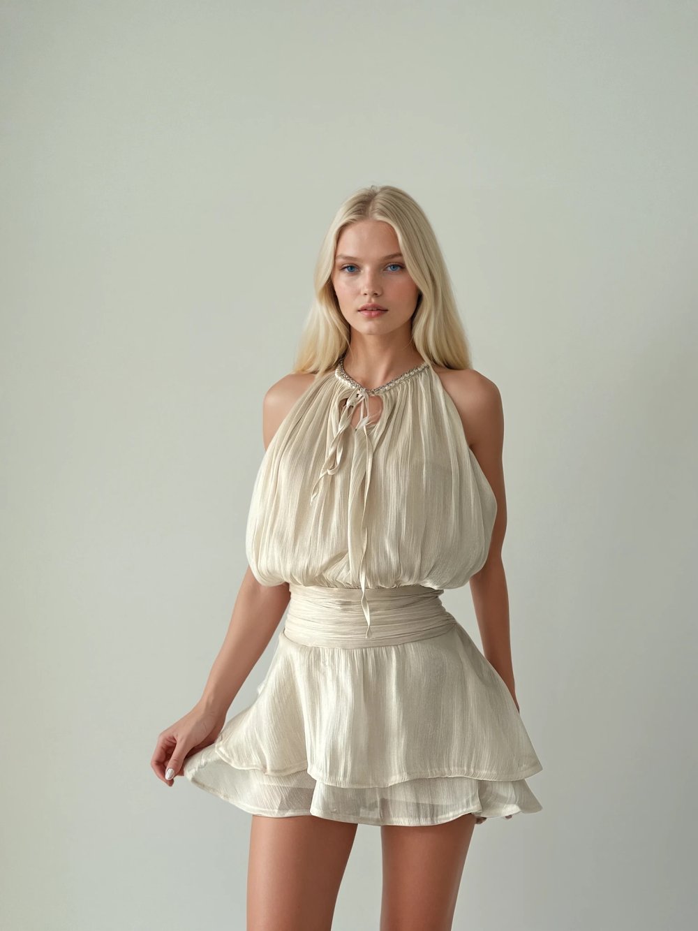 Vanesya Boncuk Detaylı Organze Tasarım Elbise Bej