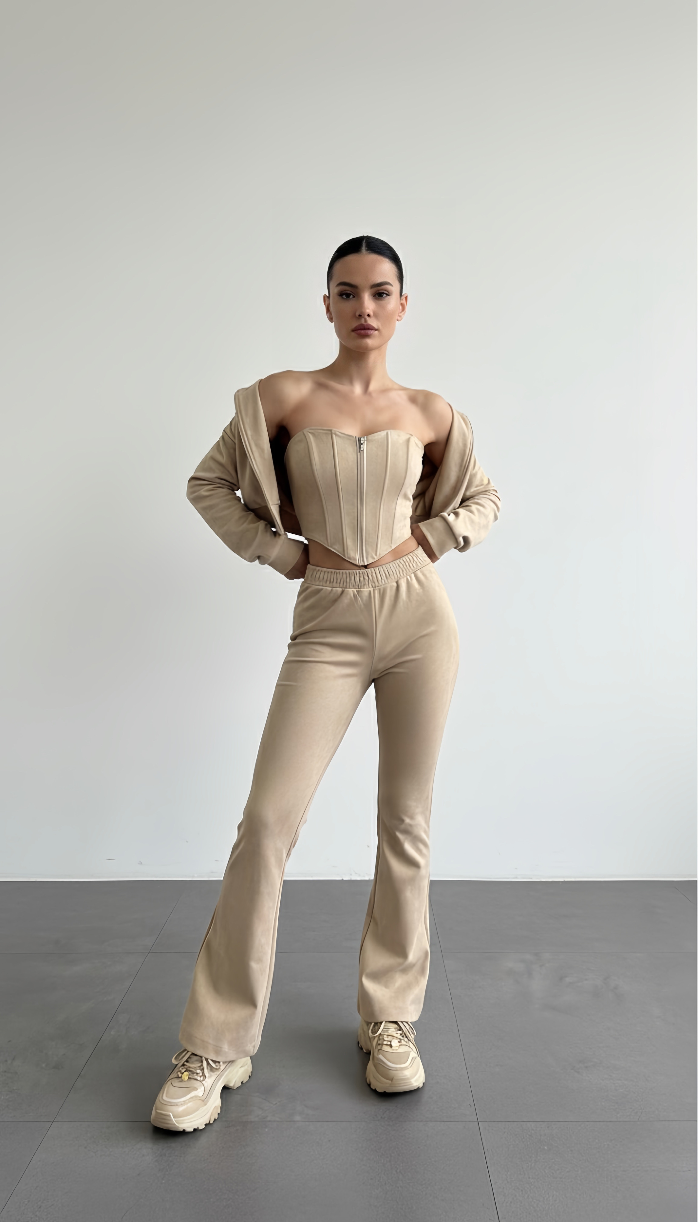 Vina Korse Detaylı Süet Üçlü Takım Bej