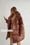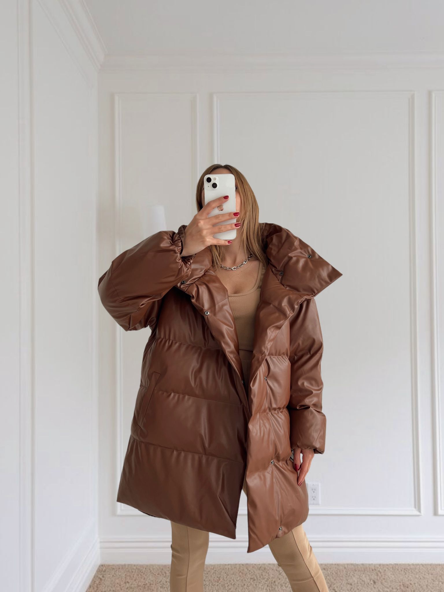 Yana Çıtçıtlı Deri Puffer Oversize Kaban Taba