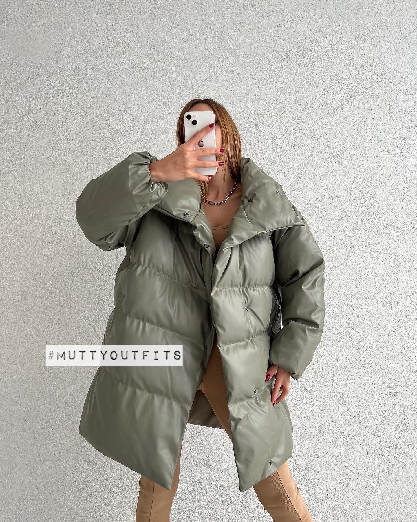 Yana Çıtçıtlı Deri Puffer Oversize Kaban Yeşil