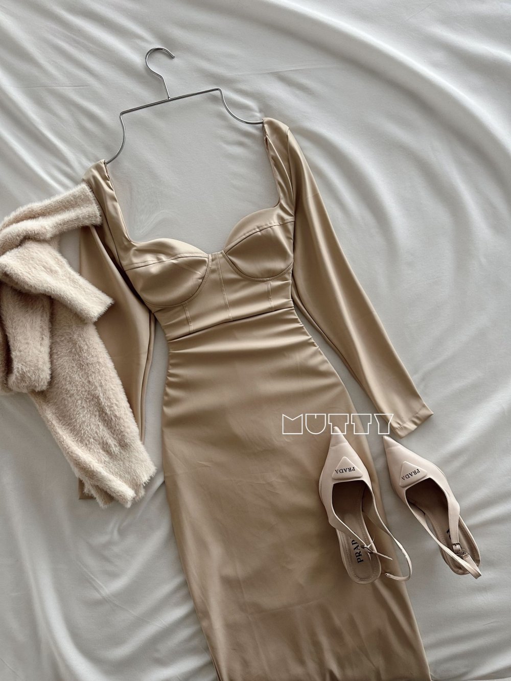 Yolande Gloplu Midi Boy Deri Elbise Bej